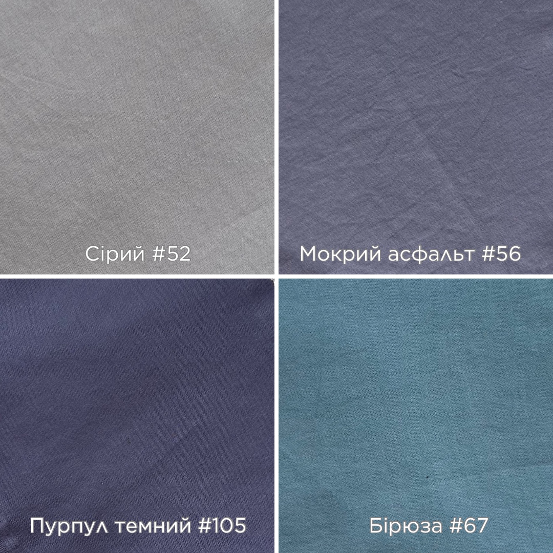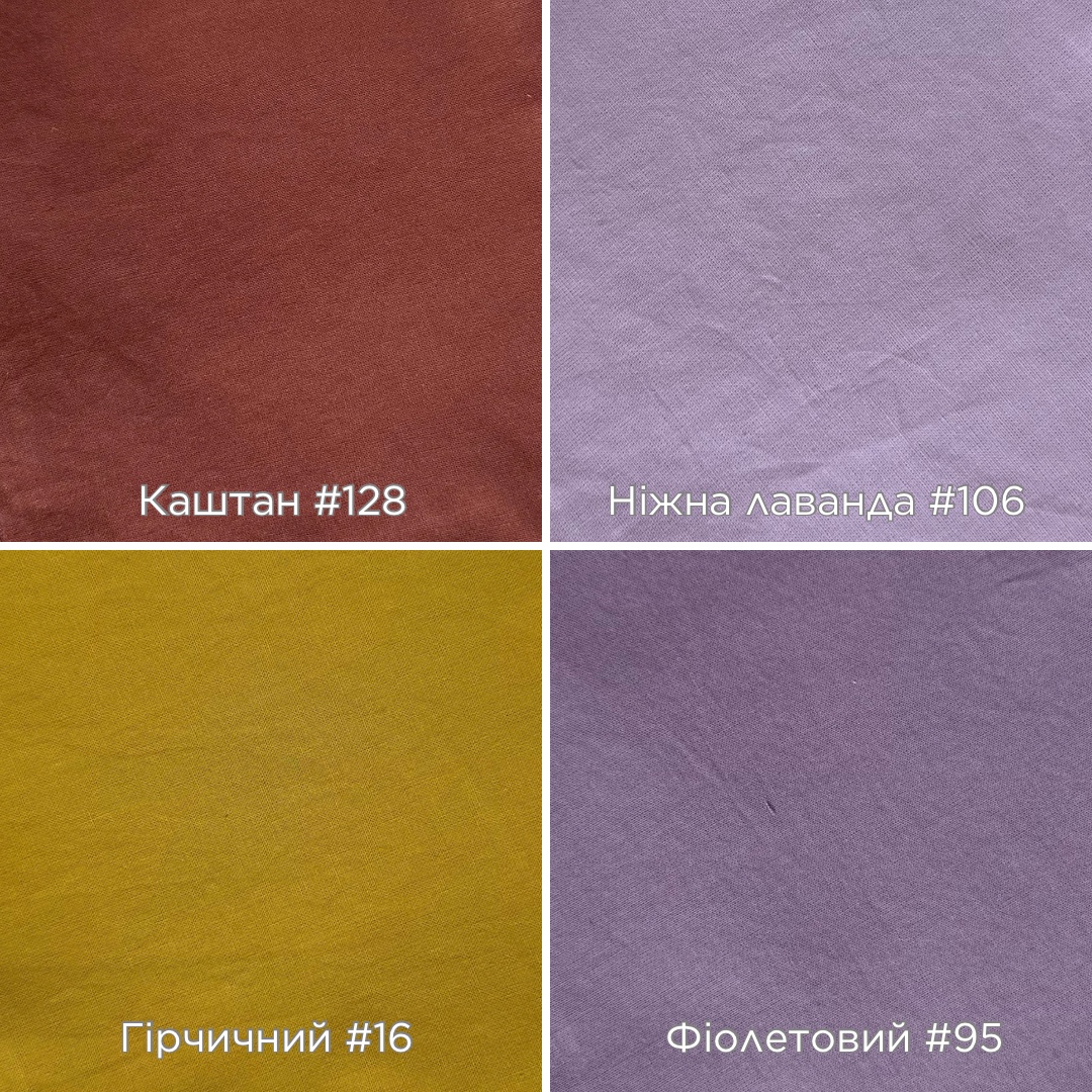 Варена бавовна (washed cotton) - натуральна сучасна постіль, для тих хто не любить прасувати Варена, тому що попередньо тканину виварюють при високих t°, за рахунок чого постіль стає супер ніжною, приємною та бархатистою Технологія «варки» дозволяє зберегти якість постілі на довгі роки експлуатації. При цьому постіль не кошлатиться, не линяє та прекрасно вентилює Вся палітра кольорів, таблиця стандартних розмірів та їх вартість в додаткових фото до товару ⇧ Підковдру можемо пошити на ґудзиках, на змійці або на запах * термін пошиття 3-5 робочих днів ** колір може відрізнятися при різному освітленні та різних дисплеях Додаткові послуги: ✓ комбінація кольорів ✓ кант на наволочках - 400грн ✓ кант на підковдрі - 500грн ✓ вшив замочків на наволочки - 300грн ✓ двосторонні наволочки - 250грн ✓ оксфордські наволочки(вушка) - 300грн Комплект приходить в гарній упаковці-чудово підходить на подарунок