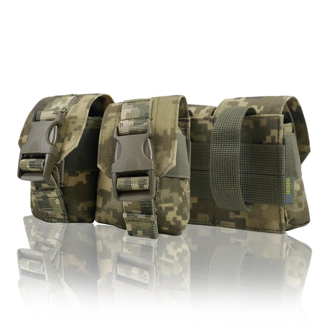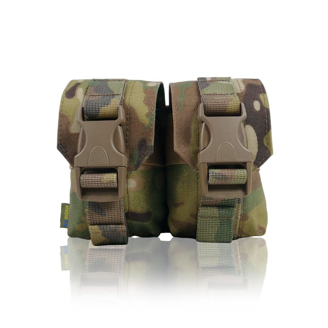 Підсумок призначений для зберігання та перенесення двох гранат. Матеріал: Cordura 1000D – надміцна тканина, стійка до протирання, розриву. Фурнітура: 100% Поліамід , який відповідає технічним вимогам Міністерства Оборони. Стінки підсумка (задня та нижня) посилені пластиком. На бокових стінках всередині підсумок має додаткову стропу для фіксації гранати. Два верхніх клапана підсумка мають додаткове внутрішнє посилення для тримання форми підсумку і кращої фіксації гранат при швидкому пересуванню. Закриваються клапани на фастекс, що забезпечує швидкий доступ до гранати. Підсумок має на нижній частині люверси, що сприяють водовідведенню у разі промокання Особливе регулювання застібки клапана дозволяє адаптувати підсумок під вміст різної довжини Еластичні резинки з обох боків забезпечують додаткову фіксацію. Система кріплення MOLLE Підсумки доступні у 5-и кольорах: піксель, мультикам, хакі койот та чорний мультикам.