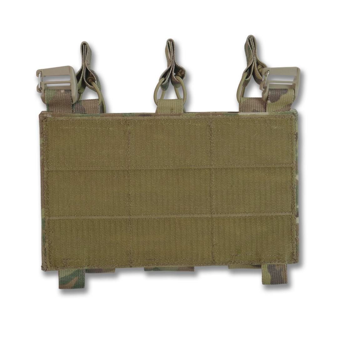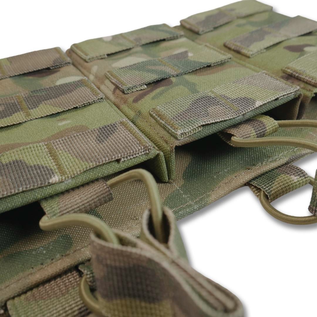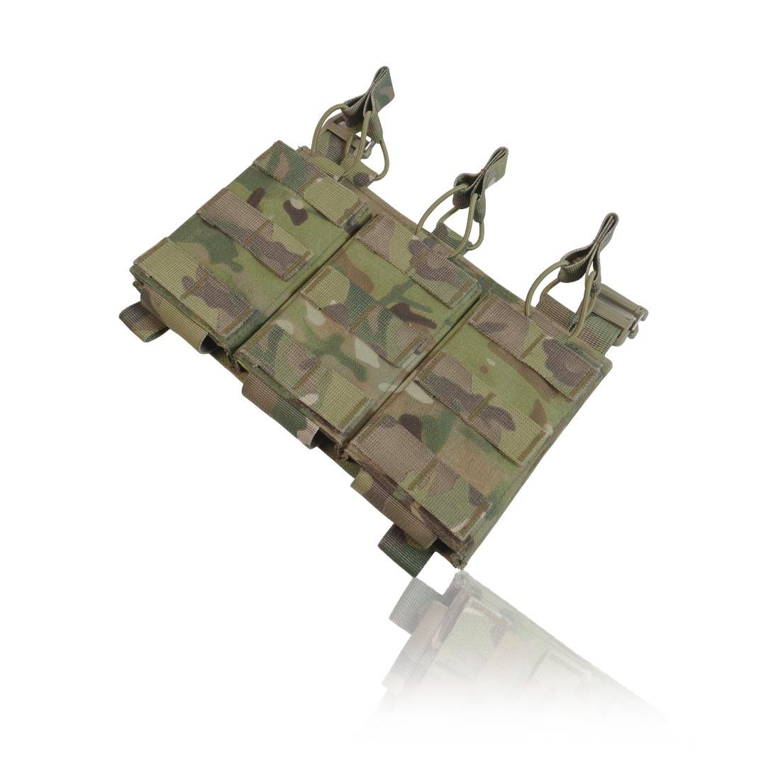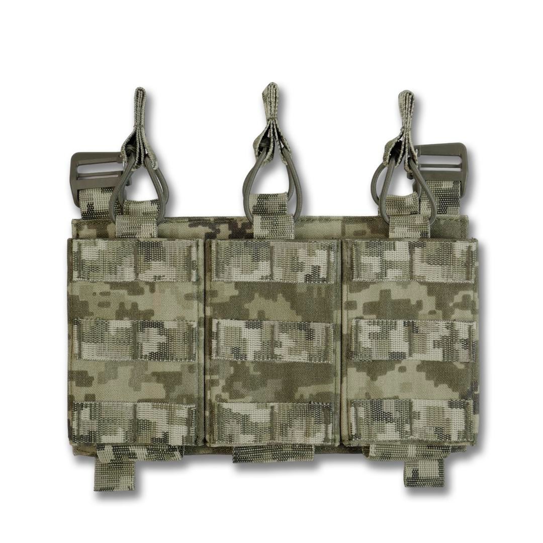 Колір: піксель, мультикам, хакі, койот, чорний мультикам. Функціональна, легка зʼємна панель з 3-ма підсумками під 1 магазин для плитоноски дозволить надійно розмістити 3-и магазина серії АК/AR/РПК та забезпечить швидке перезарядження під час виконання бойових задач. Розмір: 25х15. Основна тканина Cordura 1000D 380г/м² з NIR-просоченням, що робить виріб менш помітним у приладах нічного бачення. Має подвійне поліуретанове покриття для захисту від вологи та мастильних матеріалів, не підтримує горіння, не стирається, не вигорає на сонці, зберігає свої властивості тривалий час в екстремальних умовах експлуатації. Усі стропи 100% поліамід. Низ підсумку фіксується 5 см. стропою, яка надійно пришита та не дасть магазину випасти. Також завдяки отворам внизу будь-який бруд чи вода швидко вийдуть з нього. Система фіксації магазинів здійснюється за допомогою еластичної резинки та страхової стропи з «вушками», що забезпечують надійний захист від випадання. Завдяки продуманій конструкції, робоча поверхня хвату магазина залишається відкритою, тому маніпуляції з ним відбуваються набагато швидше. З боків і з переду ми додали пластик, щоб підсумок був надійним та добре тримав форму. Також і сама основа усієї платформи виготовлена з пластику та Кордури, такий спосіб забезпечить максимальну якість та комфорт у користуванні. Фурнітура - пластикові рамки з замком від Японського виробника WJ у формі D-кільця, які слугують з’єднувальним елементом в поєднанні з велкро липучкою дозволяють прикріпити панель на передній частині плитоноски і за потреби швидко зняти її. Внизу наявні 2 петлі зі стропи для кріплення додаткового спорядження. Підсумок забезпечить швидке перезаряджання та стане необхідним елементом індивідуального спорядження бійця.